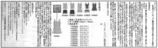 本年4月より全国の○○○○直営店及び○○○○製品取扱店にて販売しておりました下記の「女児用スイムウェア」6モデル(10品番)にて、着用および水分の浸潤により肌が透けて見えることが判明しましたので、販売を中止し、自主回収をさせていただきます。
